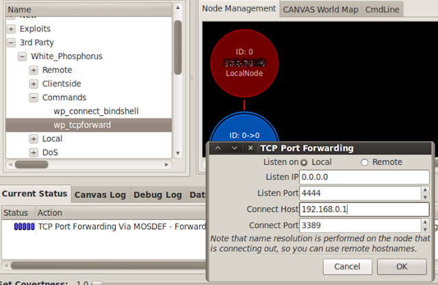 И счастливые обладатели White Phosphorus Exploit Packмогут сделать port forward поверх MOSDEF (как это не покажется странным, но в составе самого Immunity Canvas родного пробрасывальщика портов нету).