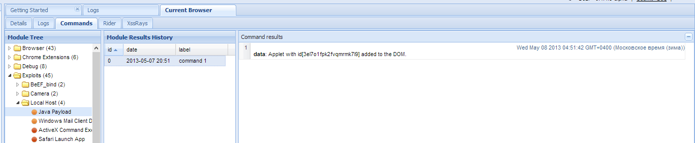 И в консоли BeEF, после того, как удалось словить клиента, следует выбрать Exploits->Local Host->Java Payload