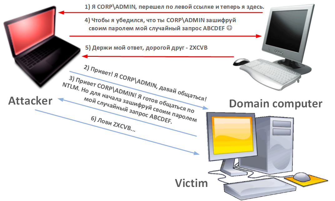 Но вернемся в прошлое. В 1996 году появляется первое исследованиена тему фундаментальной уязвимости в протоколе NTLM, а через пять лет появляется и полноценный пруфф. Суть атаки хорошо проиллюстрирована на следующей картинке.