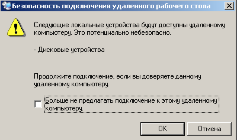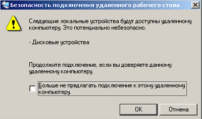 Тут-то и кроется опасность, о которой предупреждает сам rdp-клиент. Тем не менее все администраторы зачастую не обращают на это уже изрядно поднадоевшее сообщение безопасности никакого внимания (так ведь действительно проще, удобнее и быстрее!).