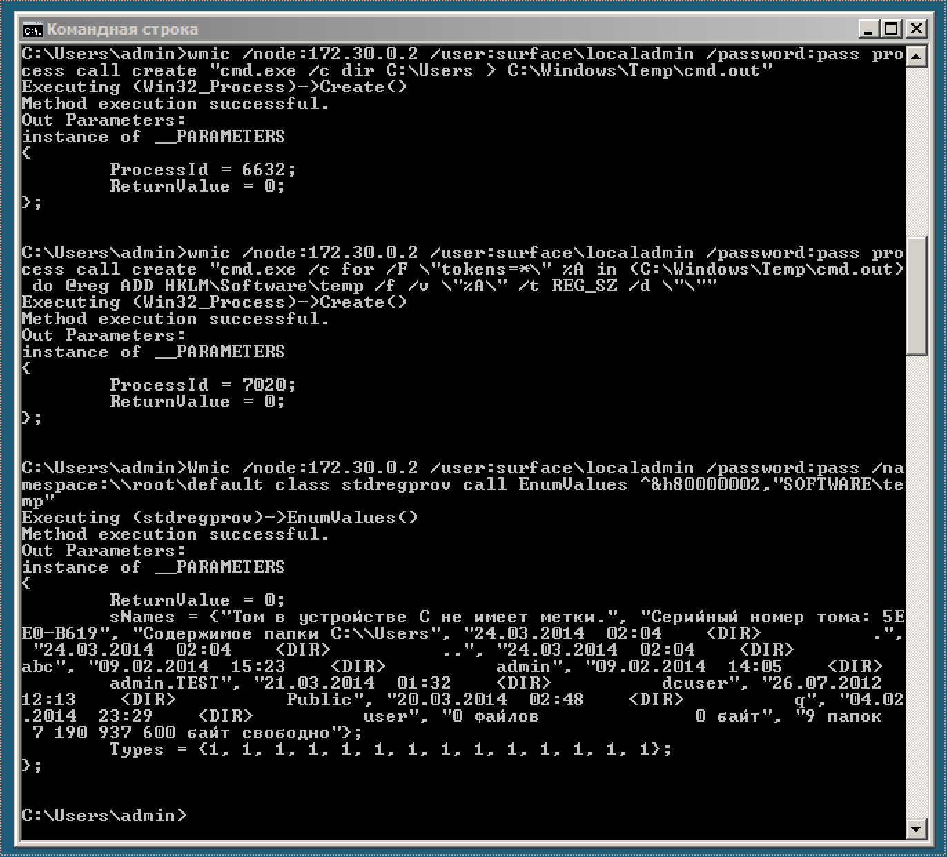 C:>Wmic /node:RHOST /user:administrator /password:password /namespace:rootdefault class stdregprov call EnumValues ^&h80000002,"SOFTWAREtemp"
