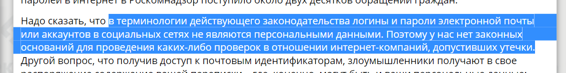 В начале сентября произошла массовая публичная утечка паролей почтовых сервисов Yandex, Mail.ru и Google. Большая часть специалистов считает, что сервера Яндекса и Мэил.ру никто не ломал, а пароли утекли от самих пользователей через кейлоггеры, фишинговые сайты и кросс-чек (использование одинаковых паролей на разных сайтах). В пользу альтернативной точки зрения - сервисы Яндекса таки поучаствовали в раздаче - говорят некоторые комментарии с Хабра и мнение руководителя Роскомнадзора, хотя он вряд ли в теме.