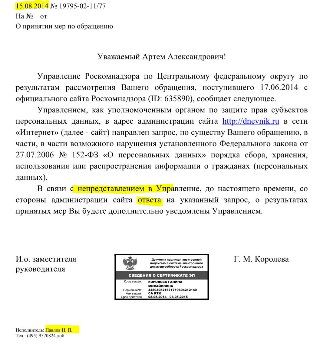 Вот так и живём. Я сижу 5 месяцев жду от Роскомнадзора ответа, а Роскомнадзор, сменив 3 исполнителей, сидит и ждёт ответа от администрации сайта. Поэтому в следующий раз когда к вам придёт запрос от Роскомнадзора - не спешите с ответом, торопить вас никто не будет!