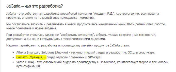 В 2009 году основанная выходцами из АНБ американская компания SafeNet купила Aladdin Knowledge Systems - мирового лидера в производстве токенов (HASP, eToken). В 2014 году Gemalto купила SafeNet.
