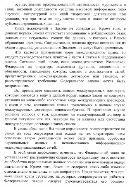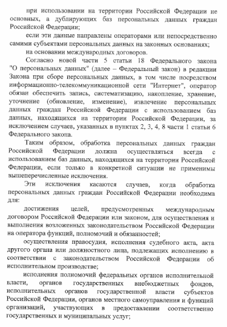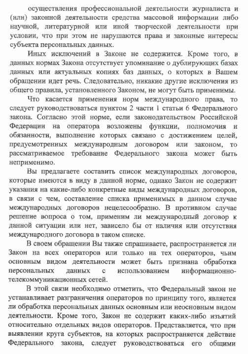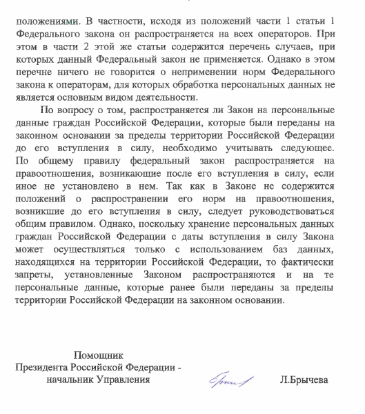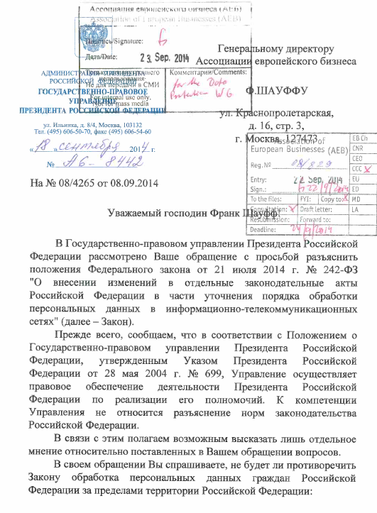 Среди слитой переписки был ответ генеральному директору Ассоциации европейского бизнеса Ф.Шауффу по вопросам о 242-ФЗ. Ничего революционного в документе нет, однако кому-нибудь все равно может пригодиться.