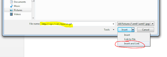 Чтобы вставить маячок в документ Word необходимо вызвать диалог добавления картинки (Insert > Pictures) и обязательно выбрать в меню вставки «Insert and Link»
