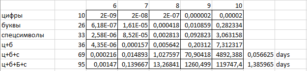 Мощность сети биткоин достигла огромных величин, и рост не останавливается. Всё это благодаря узкоспециализированным чипам ( ASIC), созданным специально для того, чтобы считать sha256 хэши, меньшие текущей сложности сети. Схема спроектирована таким образом, что возвращает только определённые хэши sha256 (если бы возвращала все - то потребовалась бы очень быстрая шина). Поэтому использовать сеть биткоин для подбора хэшей не выйдет. Но мне стало интересно, на что сегодня способно человечество, если ему нужно будет подобрать чей то пароль. Допустим вся текущая мощность сети (847,998,392 GH/s, ~10^15 хэшей в секунду) будет направлена на подбор пароля по его SHA256 хэшу. В табличке время подбора хэша с 50% шансом на успех указано в секундах.