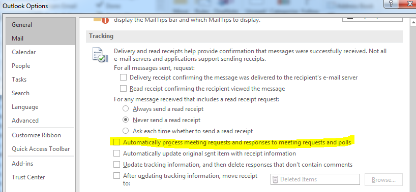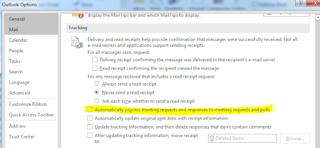 Options -> Mail -> TrackingУбираем галку "automatically process meeting requests.."