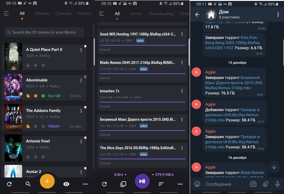 6. Мой собственный Python скрипт мониторит очередь qBittorrent. Если новый файл был добавлен, мне приходит сообщение от моего бота в семейный чат телеграм. Когда закачка завершена приходит апдейт. Если я хочу что-нибудь изменить, то есть клёвый апп (к сожалению, платный) nzb360. Через него можно управлять и Radarr и qBittorrent
