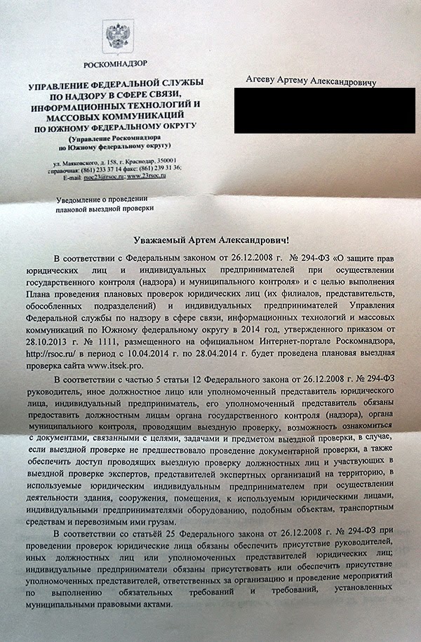 А вообще каждому блоггеру советую отправить уведомление в Роскомнадзор. Я думаю именно это они и использовали как повод чтобы внести меня в план проверки.