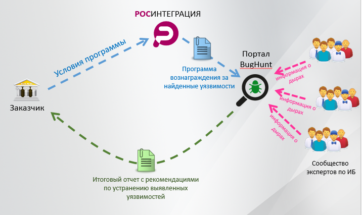 Мы заключаем договор с организацией и разрабатываем для неё уникальную программу вознаграждения за найденные уязвимости на сайте организации (bugbounty). У каждой программы есть ограничения в виде срока действия, общего призового фонда, участвующих доменов/поддоменов и другие. Мы публикуем программу на портале BugHunt, привлекаем к участию в программе независимых исследователей и обрабатываем отчеты, которые они нам присылают. После этого мы направляем организации итоговый отчет, содержащий информацию обо всех найденных дырах и рекомендации по их устранению. Организация выплачивает исследователям вознаграждение по заранее определенным тарифам: за серьезные дыры - больше, за несерьезные, соответственно, меньше (тарифы устанавливает сама организация) в рамках общего призового фонда. Обязательства и объемы выплат фиксируются в договоре между организацией и сервисом BugHunt.