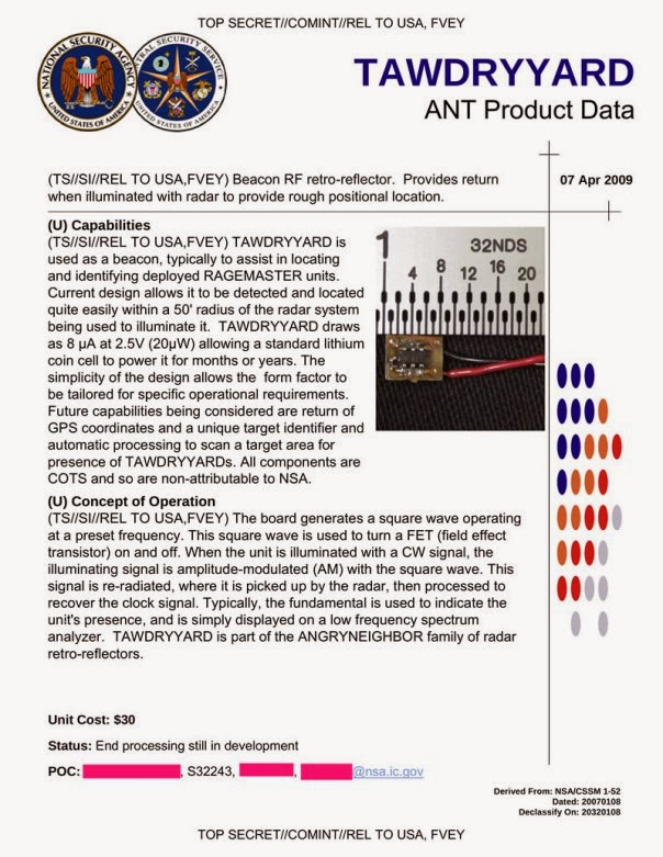 Радиометка, которая частенько используется для определения местоположения VGA кабеля с закладкой RAGEMASTER, либо любой другой цели. Легко определяется радаром с расстояния в 15 метров. Способна работать от одной стандартной часовой батарейки месяцами или годами. Сделана из общедоступных радиодеталей. Планируется встроить в нее GPS, аппаратный идентификатор и радиосканер-детектор других закладок TAWDRYYARD.