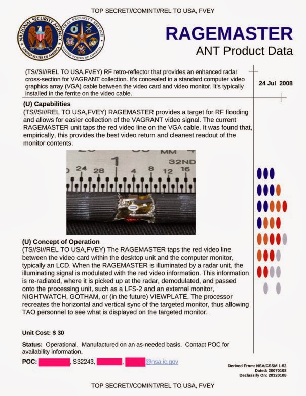 На сегодняшний момент RAGEMASTER уже почти не актуальна, так как VGA кабелей в дикой природе становиться все меньше, а с DVI, HDMI и DisplayPort этот трюк не пройдет - сигнал там цифровой и пропускная способность огромная, простеньким жучком за 30$ там не обойдешься.