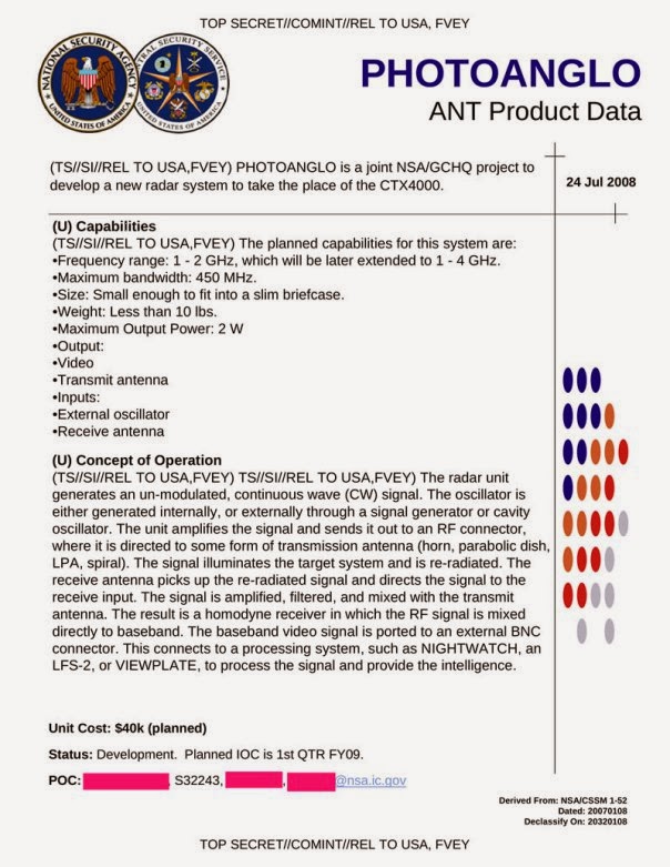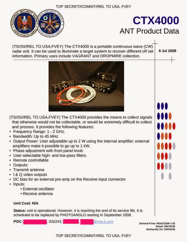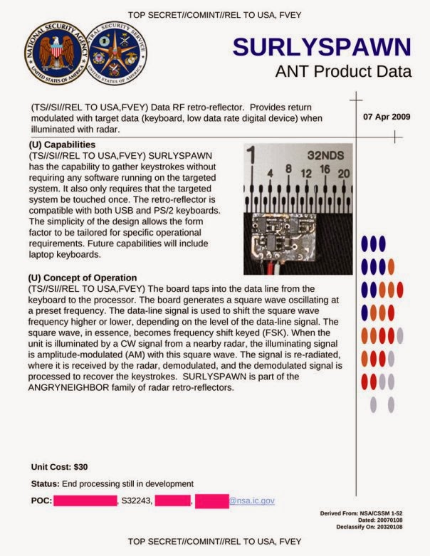 Вообщем те, кто смеялись над актуальностью ПЭМИН и спецпроверок, могут уже не смеяться. За вполне скромную сумму можно оборудовать ПК всем спектром аппаратных закладок, которые будут подслушивать, подсматривать и следить за перемещением ПК. Кроме того заявленная частота работы до 4ГГц делает подобные закладки очень опасными - детекторов и глушилок для них пока что просто нет. Насколько распространены подобные закладки материалы Сноудена умалчивают, но спектр их применения, по-моему мнению, ближе все-таки к таргетированным атакам, чем к массовому применению.