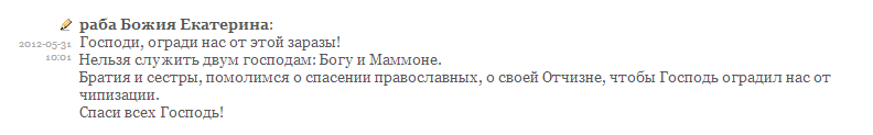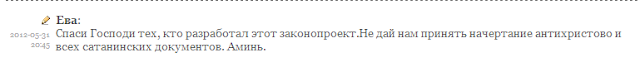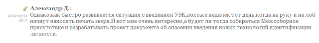 Меня не перестает удивлять то постоянство, с которым церковь не смотря ни на что умудряется все время становиться поперек прогресса... Теперь вот я должен смириться с тем, что Иоанну Богослову привиделась Универсальная Электронная Карта в образе зверя-антихриста, и я должен стоять в очередях, ожидая пока вредные тетки вручную вбивают ФИО и адрес каждого клиента вместо того, чтобы просто провести картой по считывателю. Любое воззвание к здравому смыслу православных будет несомненно расценено как "оскорбление чувств верующих"!