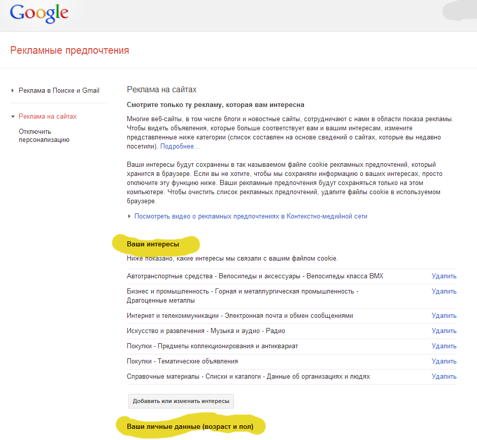 По-умолчанию персонализированная реклама включена на всех google аккаунтах. Отключить её (или проверить, какую инфу о вас уже успел накопать Google) можно пройдя по ссылке: