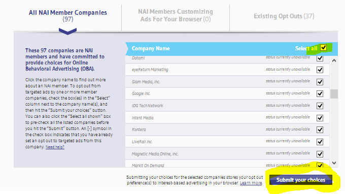 Сам же Google так же предлагает зайти на страничку http://www.networkadvertising.org/choices/ (или еще эту http://www.aboutads.info/choices/) и отказаться от сбора индивидуальной информации другими любопытными рекламными компаниями. Вот так: