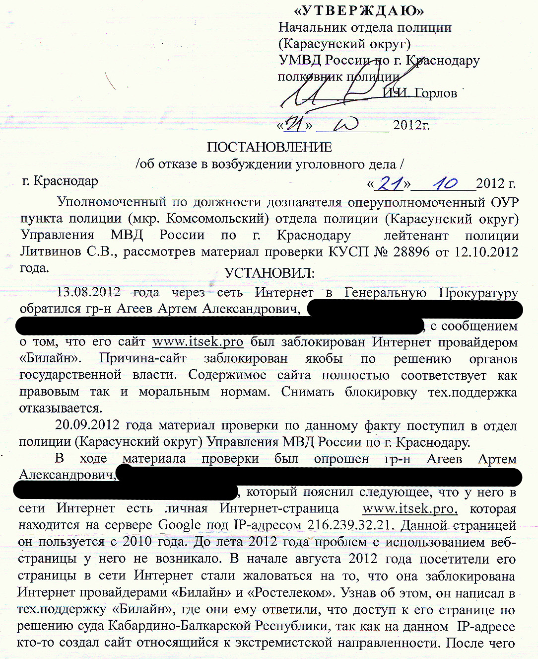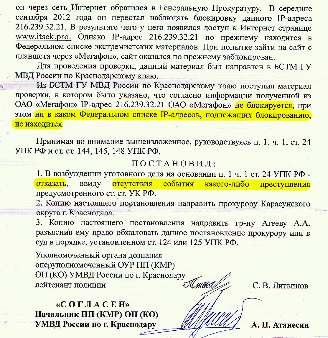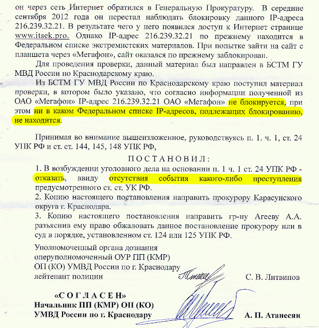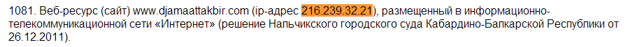 Ребята из районного отдела полиции не пнули мое заявление сразу (за что им отдельное спасибо), а переслали его по моей просьбе в БСТМ, которое даже запросило Мегафон о блокировке IP адреса 216.239.32.21.