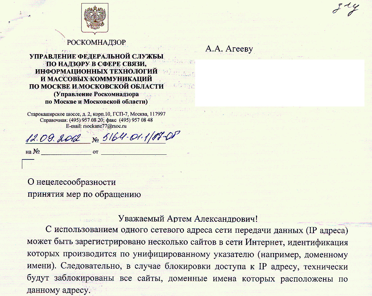 Вот что на мой запрос ответила Федеральная служба по надзору в сфере связи, информационных технологий и массовых коммуникаций, входящая в структуру Министерства информационных технологий и связи, уполномоченная на ведение черного списка сайтов: