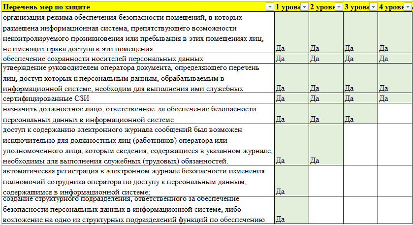В зависимости от уровня защищённости, необходимо принимать следующие меры по защите ПДн: