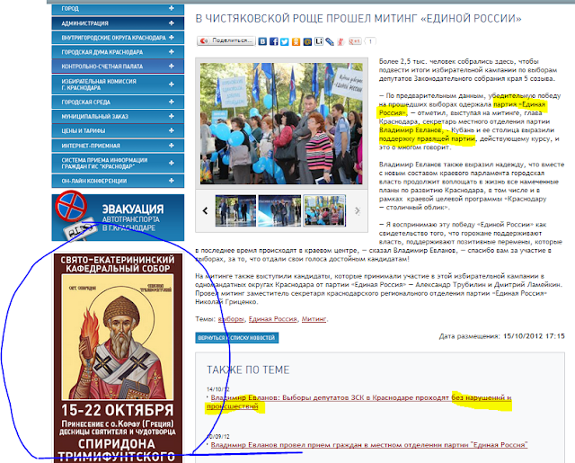 На официальном сайте города Краснодара пишут про партийный съезд, на котором секретарь Единой России и по-совместительству мэр города Владимир Евланов говорит о народной поддержке правящей партии и её курса. Того самого курса, который привел к резне в Кущевке, бардаку в Крымске и травле экологов. Какого черта партийные новости делают на официальной странице города? Почему в таком случае там нет и не будет никогда новостей о других партиях? И что делает реклама костей какого-то Спиридона Тримифунтского на главной странице города Краснодара?? Почему Министерство культуры Краснодарского края и Администрация Краснодара являются спонсорами православного кинофестиваля? Наши налоги некуда девать?