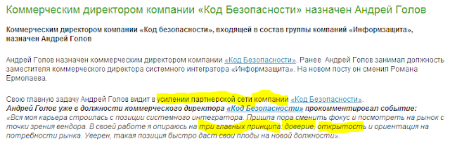 Дабы познакомиться с новым коммерческим директором поближе, давайте взглянем на соответствующую новостьна сайте Кода безопасности: