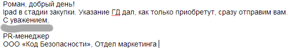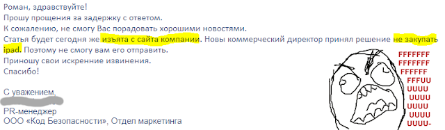 Мне остается только догадываться о размере того бардака, который видимо царит среди топ-менеджмента крупнейшего вендора в России, если такая компания как Код Безопасности не нашла 20 тысяч рублей на iPad и просто решила кинуть инженера, ежедневно устанавливающего их продукты заказчикам.