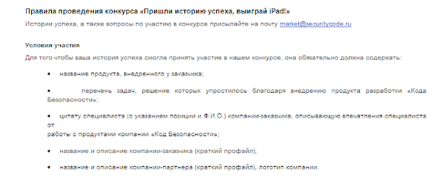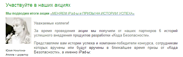 Написав историю о внедрении продуктов КБ, инженер имеет все шансы получить iPad. Код Безопасности же пополняет свои маркетинговые материалы очередной благодарностью и публикует соответствующие новости о компании в различных новостных лентах.