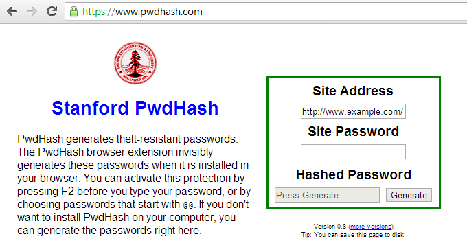 Чтобы использовать PwdHash, достаточно щелкнуть в поле пароля и нажать f2 (либо ввести два символа @@, если нет клавиш f2 под рукой):