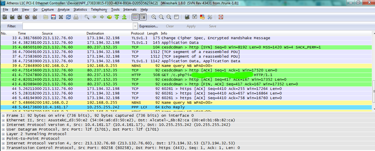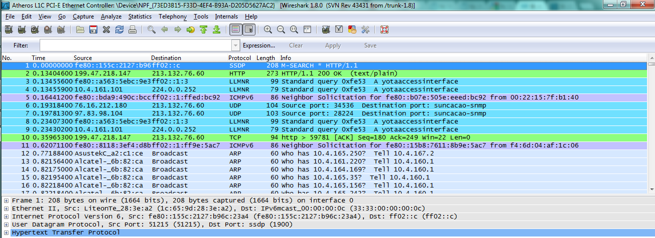 Запускаем Wireshark и проверяем. Исходящий трафик: