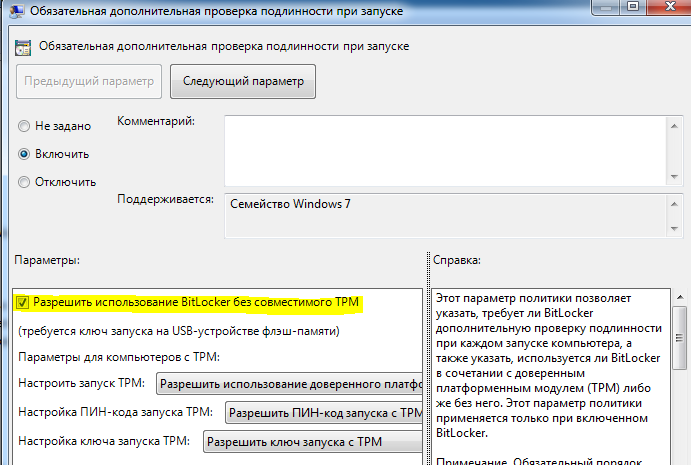 Открываем оснастку gpedit.msc. Затем "Конфигурация компьютера" -> "Административные шаблоны" -> "Компоненты Windows" -> "Шифрование диска BitLocker" и ставим заветную галочку.