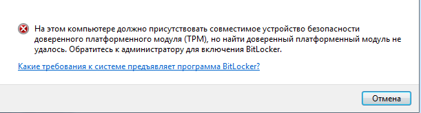 При попытке зашифровать весь диск, мы наткнемся на вот такое вот сообщение об отсутствии TPM модуля в системе: