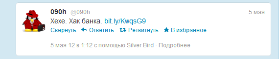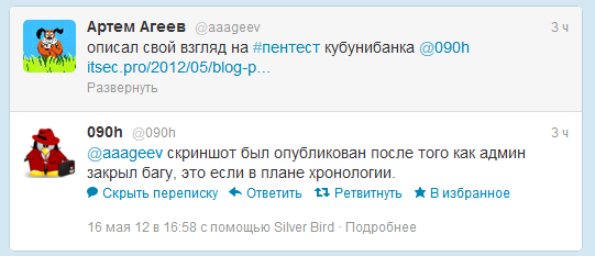 В час ночи 5 мая была обнаружена классическая дыра в одном из скриптов банка. В теле твита так же содержалась ссылка с демонстрацией возможности взлома + был выложен скриншот.