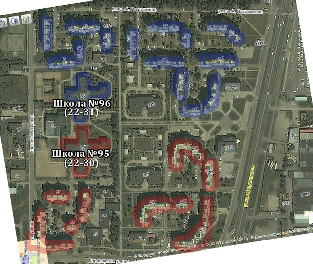 Обе школы расположены в квадрате города, очерчённом улицами Дзержинского, Кореновской и Покрышкина. В обеих школах расположены избирательные участки: 22-30в СОШ №95, и 22-31в СОШ №96. На карте я выделил красным цветом дома, которые относятся к участку 22-30, и синим цветом дома, которые относятся к участку 22-31.