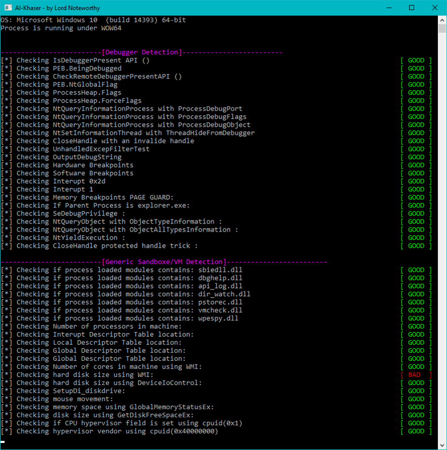 Запускать al-khaser стоит только в контролируемой среде. Это звучит очевидно, но здесь много подводных камней: бинарник намеренно демонстрирует техники, которые могут выглядеть как активная атака для систем мониторинга, а значит детектируемость может привести к автоматическим блокировкам, оповещениям SOC и даже запуску отката в продакшне, если кто-то по ошибке запустит тест на рабочей системе.