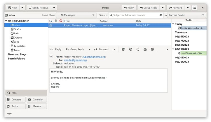Evolution — самый близкий к Outlook по ощущениям. Почта, календарь, контакты, задачи и заметки живут в едином окне, интеграция с рабочим столом GNOME родная, а поддержка Exchange/Office 365 реализована через EWS/MAPI-коннекторы. Интерфейс немного консервативный, зато корпоративные сценарии — делегирование, крупные ящики, правила — ощущают себя как дома. Иногда отдельные «фишки Outlook» ведут себя капризно, но в целом это главный кандидат для офиса, где от слова «Exchange» у всех начинает дергаться глаз, если что-то не синхронизируется.