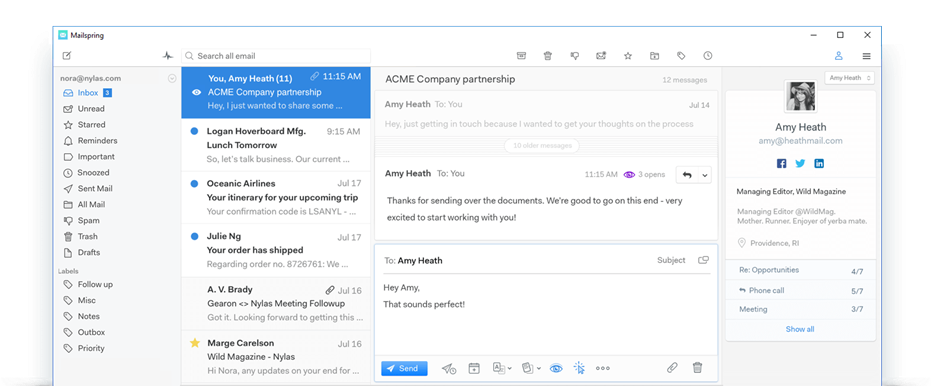 Mailspring — минимализм, скорость и современный вид. Если важнее лёгкость и визуальная полировка, этот клиент радует быстрым поиском, «диалоговым» видом переписок, удобной работой с несколькими ящиками и поддержкой Office 365, Gmail и обычных IMAP-аккаунтов. Есть полезные штуки вроде отложенной отправки и «дремоты» писем, но календарь и контакты тут не в центре мира. Некоторые продвинутые возможности находятся по сторону платной версии — что, впрочем, честно заявлено.