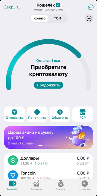 - Купить USDT или TON: в разделе «Купить» выберите способ — банковская карта или P2P. Партнёры показывают комиссию до подтверждения операции.