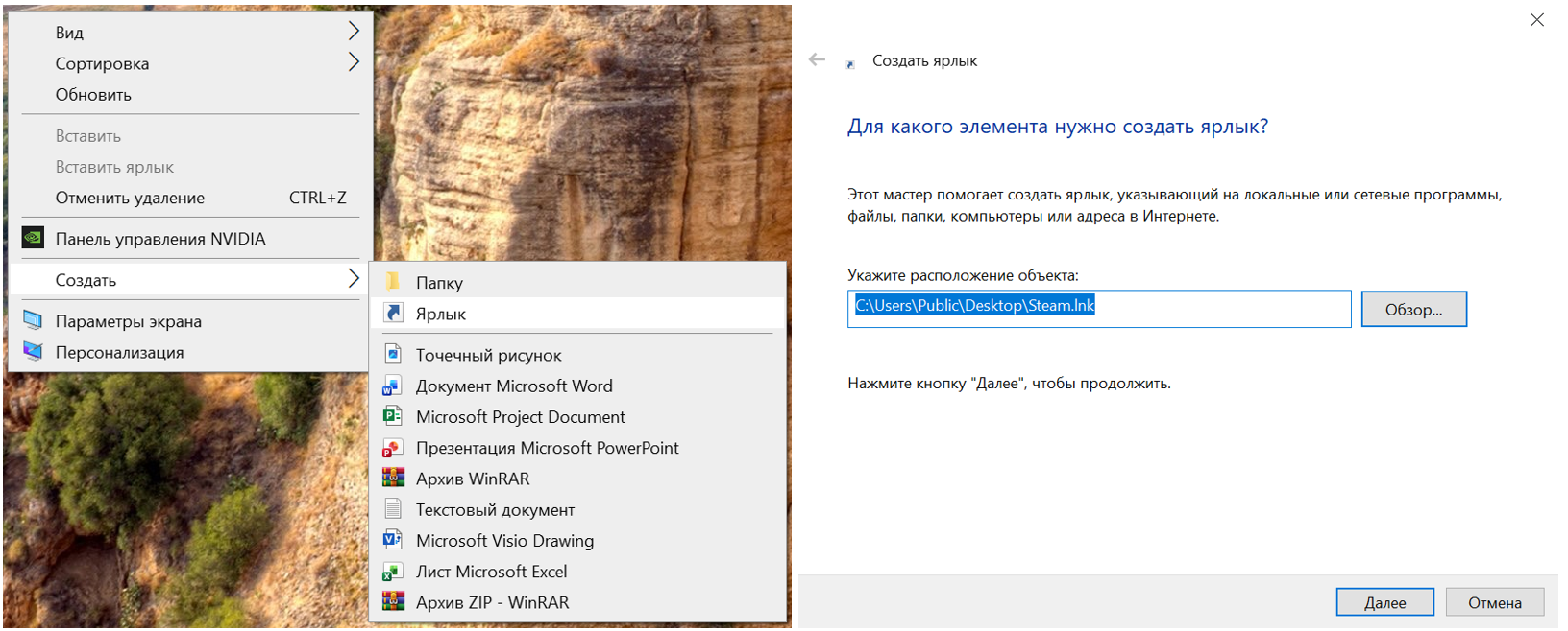 - Через мастер: правый клик по рабочему столу → «Создать» → «Ярлык» → «Обзор» → выбрать папку → «Далее» → задать имя → «Готово».