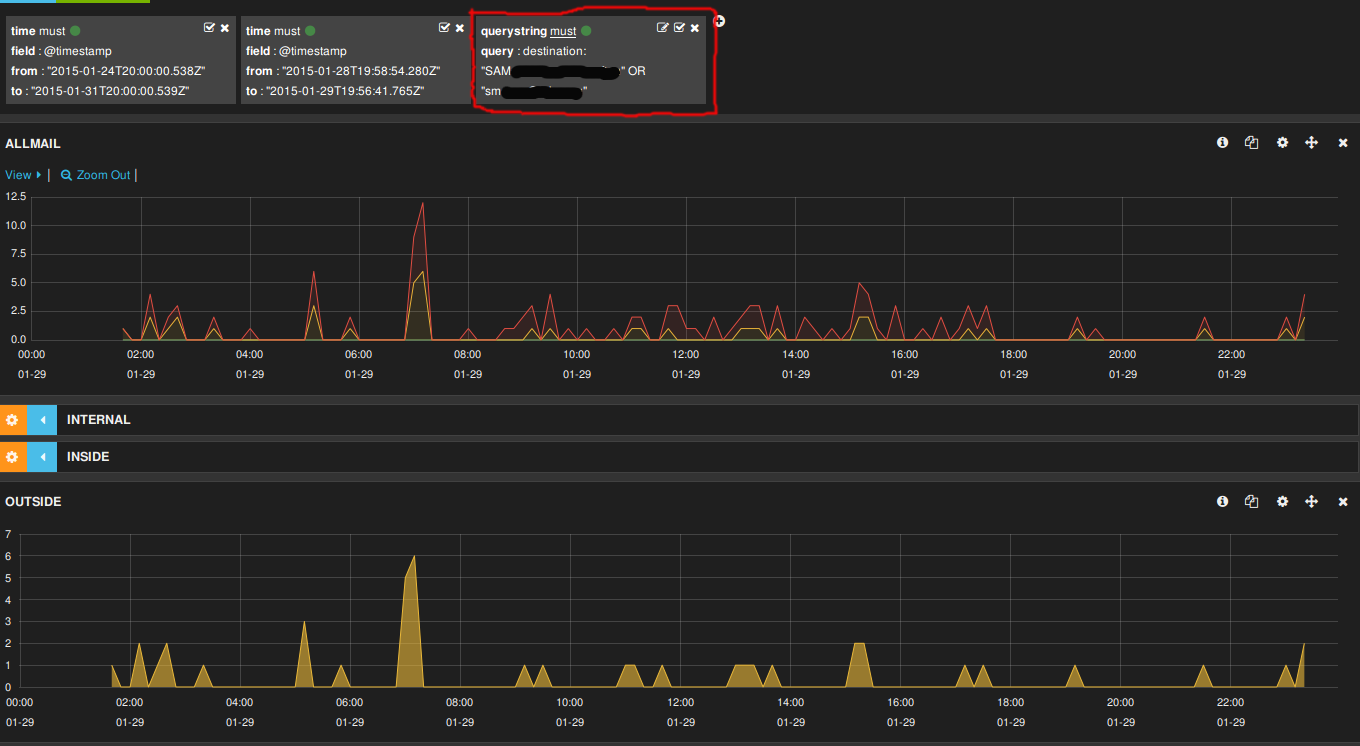 Итак открываем dashboard “Maillog analysis” (пример сделан на данных последней недели января). Выберем четрверг с полуночи до полуночи. На периоде в сутки, как будет видно дальше, анализ проще.