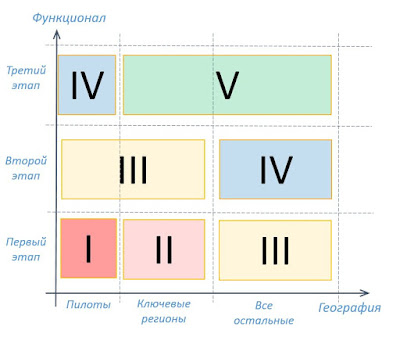 Цель данной заметки, как и большинства других в этом блоге, не дать конкретные решения конкретных проблем, а дать идею, подход. Есть миллиард контекстно-зависимых условий, о которых автор может и не предполагать, но в той или иной степени влияющих на конкретный подход. Поэтому количество функциональных и географических этапов может быть не три, а меньше или больше, но главное - то, что они должны быть, поскольку это позволит вам пользоваться результатом в широком покрытии еще задолго до формального окончания проекта, когда все функции продукта реализованы во всех географических локациях.
