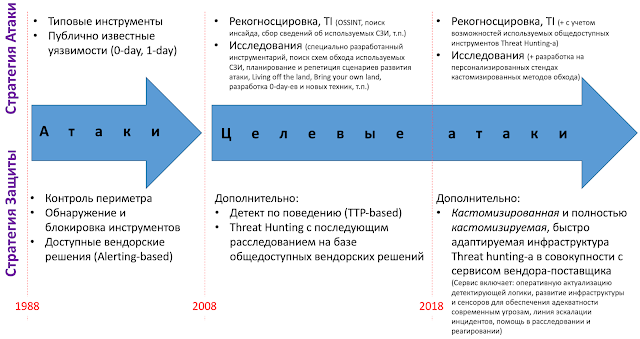 Второй абзац этой заметки поясняет почему функционал коробочных решений ограничен (широкий функционал имеет большое TCO, что никому не нужно). Но, к сожалению, и гибкого opensource недостаточно. И, что самое главное, не хватает исследований, как операционного процесса Исследований на базе собственных расследований - недостаточно, но, в любом случае, это лучше чем ничего не делать вовсе, или гоняться за ведьмами. Как отмечал здесь, чтобы иметь возможность обнаружить уникальную атаку в конкретной инфраструктуре, нужно в принципе иметь практику обнаружения уникальных атак, поставленную на operations (как минимум, на уровне зрелости, когда процесс повторим, чтобы повторить его у Заказчика), а найти уникальную атаку - это исследования. Причем, это не только люди, занимающиеся исследованиями на постоянной основе, это и детектирующие сенсоры, и инфраструктура обрабатывающая телеметрию с сенсоров, и огромная база всевозможного Threat Intelligence, начиная от тупых IoC-ов и репутации объектов, заканчивая информацией о группировках, применяемых техниках и тактиках. Бесконечное развитие современных атак требует бесконечной гибкости от используемых инструментов, а защита от постоянно мутирующего атакующего требует постоянной адаптации СЗИ - это и есть тот самый процесс безопасности, о котором все говорят - иметь в любой момент времени состояние защитных мер адекватным современным угрозам.