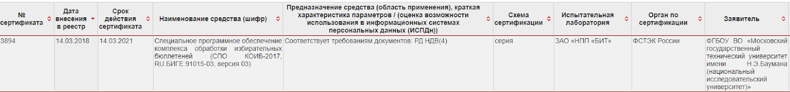 Чтобы хакеры иностранных государств не посмели вмешаться в наши выборные процессы, софт «Специальное программное обеспечение комплекса обработки избирательных бюллетеней» также проходит проверку на НДВ. Интересно, что заявителем (и разработчиком, как показал быстрый гуглопоиск) таких КОИБ является МГТУ им. Н.Э. Баумана. Их тоже инспектирует сам ФСТЭК.