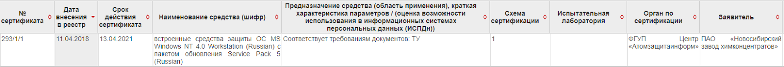 Напоминаю, что подробно я просматривал сертификаты, выданные в 2018 году. Оказывается, в этом самом 2018 бывает и «MS Windows NT 4.0 Workstation». Я не поленился найти дату выпуска этой ОС: 24 августа 1996 г. Видимо, такого зверя не смогла проверить ни одна испытательная лаборатория (в соответствующей графе пусто).