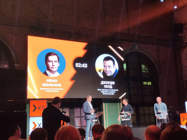 Зайду, пожалуй, с козырей, дважды подмухлевав. Во-первых, данное мероприятие на самом деле про технологии в целом и их применение в ритейле в частности, а не узко поИБэ. Как озаглавили организаторы – «это диалог о будущем и настоящем цифровизации бизнеса, впервые X5 Retail Group собрал на одной площадке визионеров, выявляющих будущие тренды уже сегодня, и экспертов-практиков, активно внедряющих самые современные технологии». Во-вторых, оно было организовано не кулуарно, а с настоящим размахом, что не помешало чувствовать себя свободнее, чем на большинстве официальных конференций. Мне понравился сам подход, местами весьма смелый. Классический доклад, по сути, был всего один – от футуролога Хироши Хори (Hakuhodo Institute of Life and Living, Япония), он рассказывал о мире будущего, о моделях поведения людей и о том, что очень скоро мы все будем жить в одном из четырех типов стандартизированных городов. Я со многим не согласен, прежде всего с тем, что это наступит в обозримой перспективе, но послушать было интересно. Остальная часть деловой программы состояла из живых разговоров с неприкрытым троллингом и настоящих баттлов действительно серьезных ТОПов: с ограниченным временем, четким заданием, жесткими правилами. Это было по истине шоу для зрителей, заметно, что спикеры готовились, прослеживался главный фокус – все ради аудитории. Стоит ли говорить, что ни о какой рекламе собственных продуктов не было и речи. Все приведенные примеры логично служили поддержкой отстаиваемых спикерами аргументов. В кулуарах встречались крайне общительные коллеги, всем спикерам также можно было свободно позадавать вопросы. Возможно, смелость вызвана отсутствием регуляторов – ну и пусть. Завершилась «ночь будущего» концертом кавер-группы и оранием рок-хитов. С последним и у нас в отрасли, вроде как, проблем нет. Итог банален: любое мероприятие должно иметь свою цель. Мне, как в данном случае потребителю хлеба и зрелищ, очень импонирует продуманность, подготовка и забота о слушателях. Ради тебя приложено немало сил, и это приятно ощущать. Как в этом всем (и нужно ли) совмещать профит для организаторов и спонсоров – вопрос отдельный, оставим за скобками.