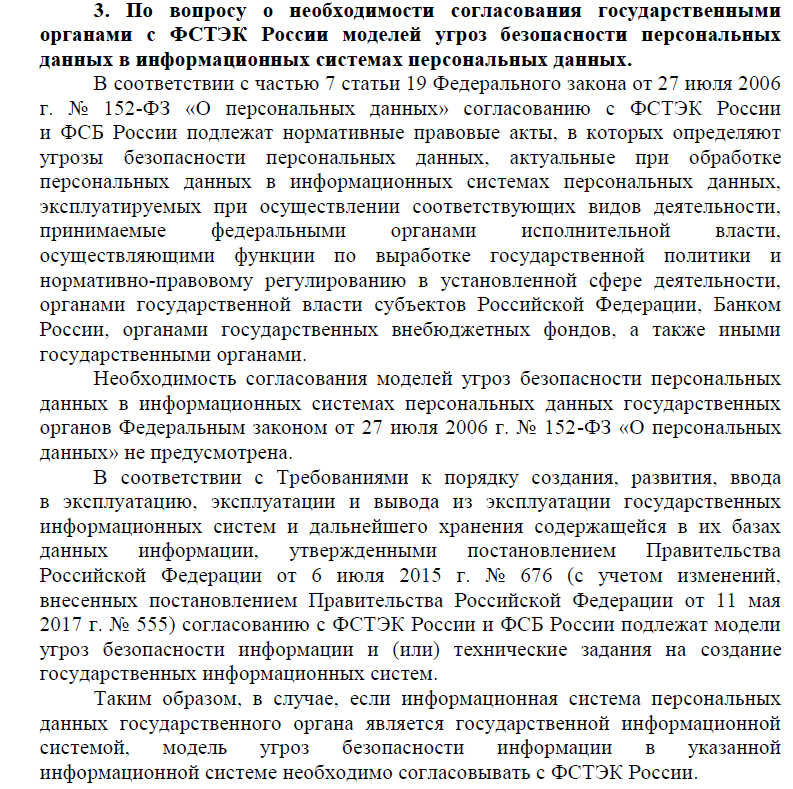 3. В соответствии с ч. 5 ст. 19 Федерального Закона от 27 июля 2006 г. "О персональных данных" №152-ФЗ (далее - 152-ФЗ) Федеральные органы исполнительной власти, осуществляющие функции по выработке государственной политики и нормативно-правовому регулированию в установленной сфере деятельности, органы государственной власти субъектов Российской Федерации, Банк России, органы государственных внебюджетных фондов, иные государственные органы в пределах своих полномочий принимают нормативные правовые акты, в которых определяют угрозы безопасности персональных данных, актуальные при обработке персональных данных в информационных системах персональных данных, эксплуатируемых при осуществлении соответствующих видов деятельности, с учетом содержания персональных данных, характера и способов их обработки (т. е. Модели угроз).