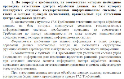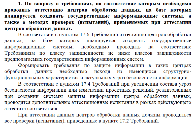 1. В соответствии с пунктом Требований 17.6 в случае, если информационная система создается на базе центра обработки данных уполномоченного лица, такой центр обработки данных должен быть аттестован по классу защищенности не ниже класса защищенности, установленного для создаваемой информационной системы.