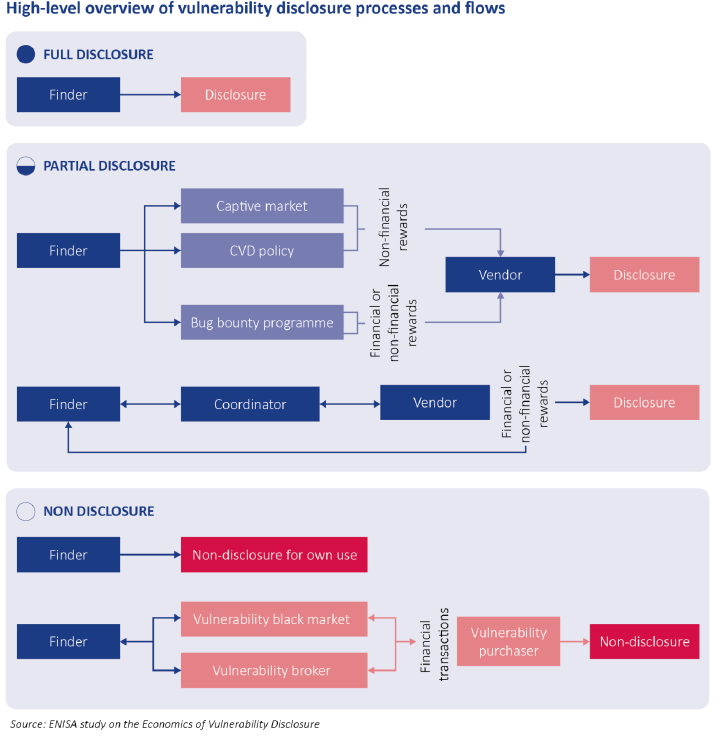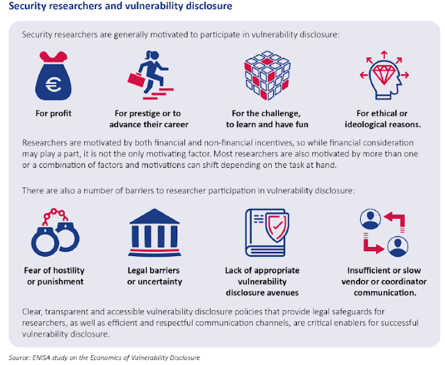 Под новый год ENISA (регулятор по ИБ евросоюза) опубликовал интересный документ по анализу и экономике процессов раскрытия уязвимостей - Economicsof Vulnerability Disclosure. В своем исследовании они опирались также на другой свежий документ - Software Vulnerability Disclosure in Europe от CEPS.