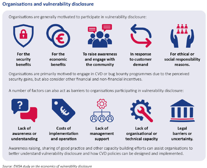 В документе ENISA подробно рассматриваются возможные участники процессов поиска уязвимостей и раскрытия информации о ней. Их мотивация, проблемы с которыми они сталкиваются и опасения.
