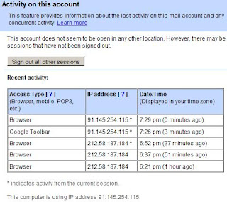 К нашей радости и к неописуемому восторгу нашего героя, в Gmail (оказывается) присутствует очень удобная функция просмотра активности учетной записи. Включая сессии, осуществленные по POP3/IMAP, в веб-интерфейсе, с мобильного и т.д. Воспользоваться этой чудо-фичей можно нажав на ссылку "Details" внизу страницы Gmail.